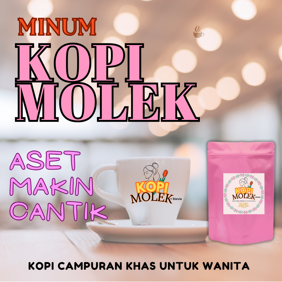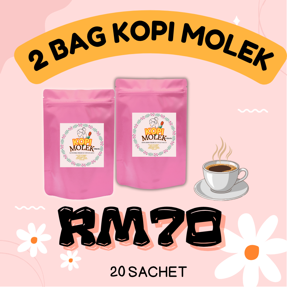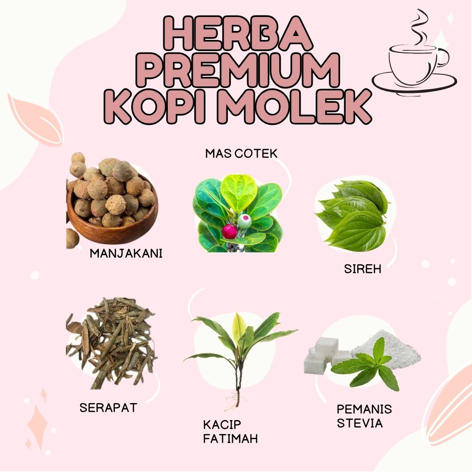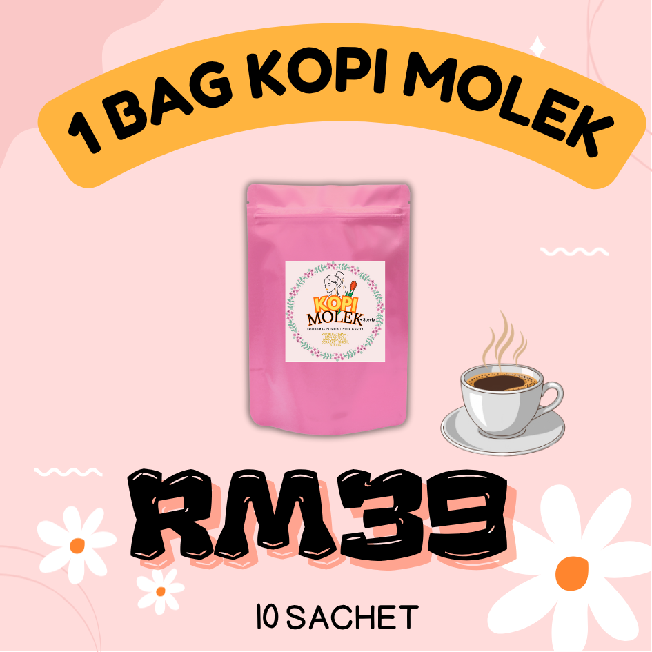 Kopi Molek menggabungkan kebaikan kopi beserta herba yang baik untuk semua wanita. Mas Cotek, Manjakani , Sireh, Serapat, Kacip Fatimah & Pemanis Stevia.