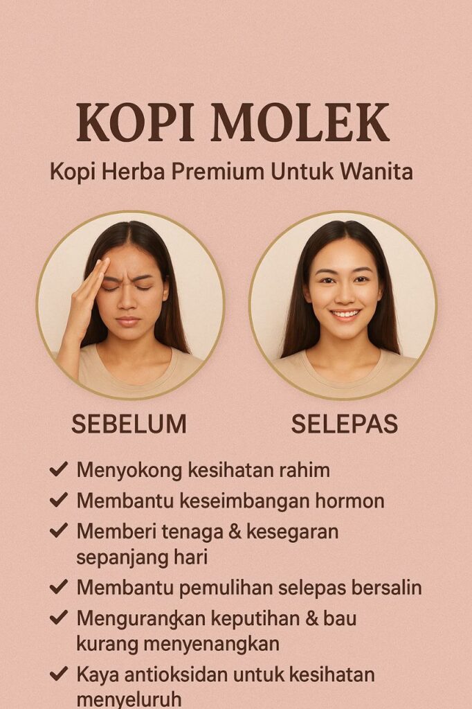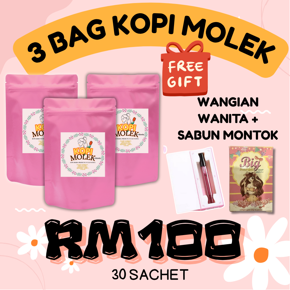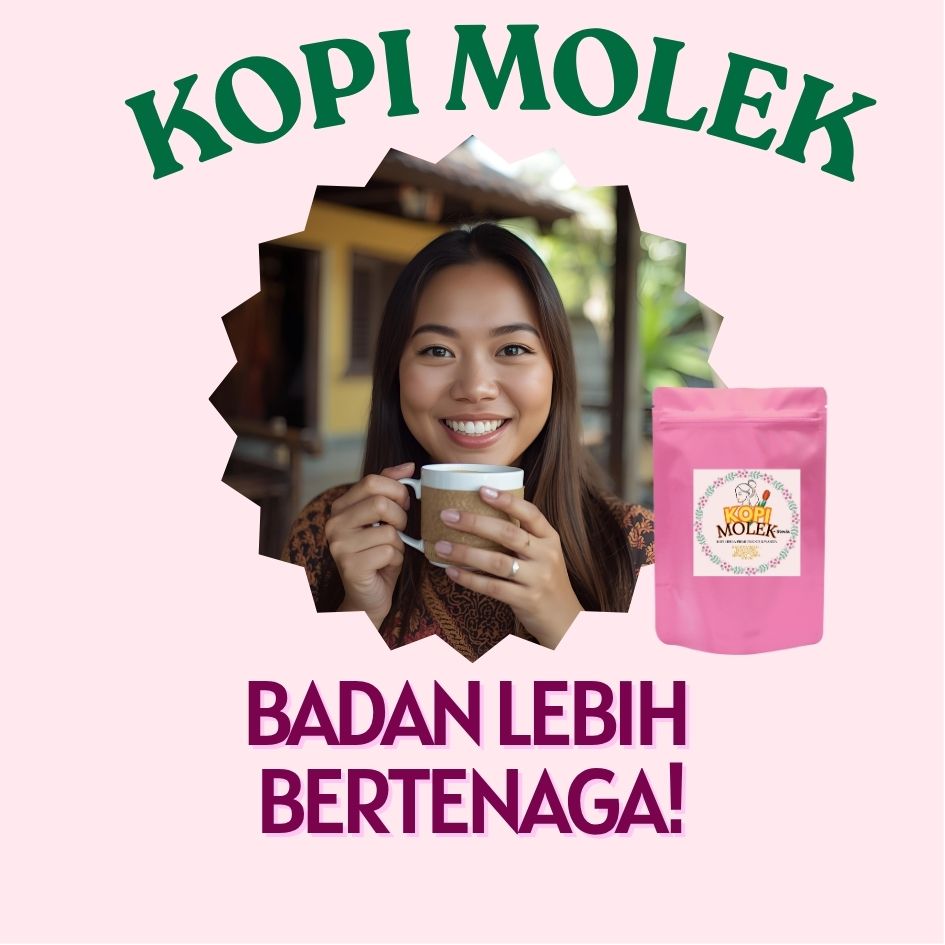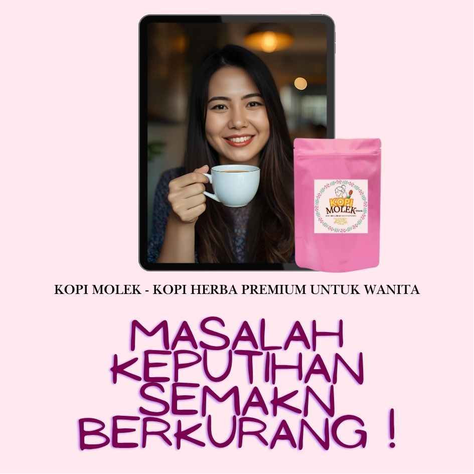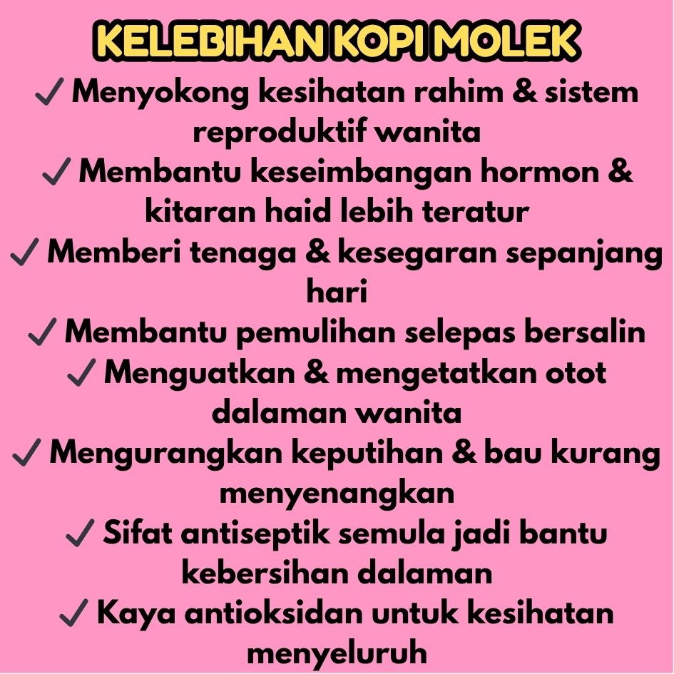 Kopi Molek menggabungkan kebaikan kopi beserta herba yang baik untuk semua wanita. Mas Cotek, Manjakani , Sireh, Serapat, Kacip Fatimah & Pemanis Stevia.